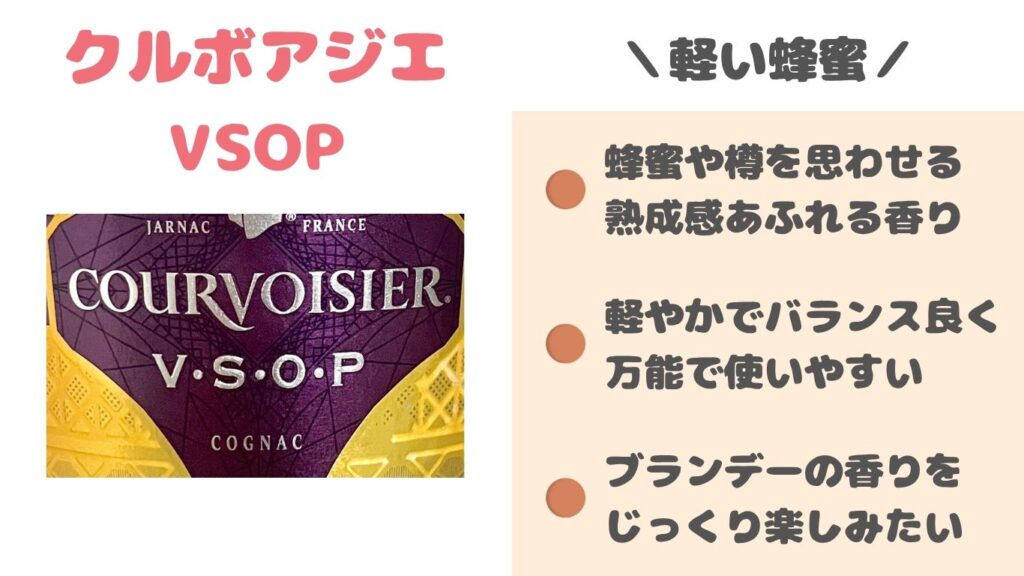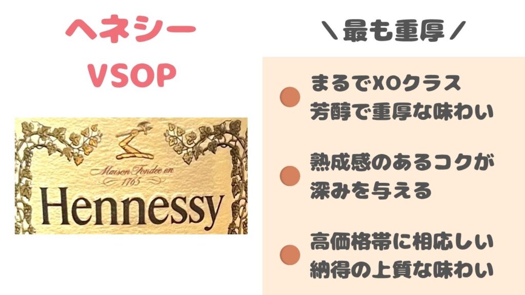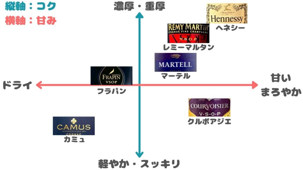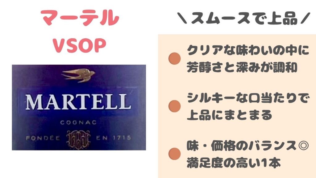 もう少し軽めが好きならカミュVSOP、香り重視ならマーテルVSOPがおすすめです。