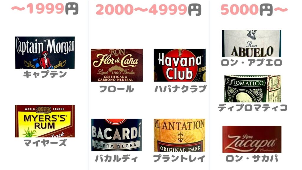 ロゴ ロンアブエロの写真 バカルディの写真 ハバナクラブの写真 フロールデカーニャの写真 プラントレイの写真 マイヤーズの写真 キャプテンモルガンの写真 ロンサカパの写真 ディプロマティコの写真 ディクタドールの写真
