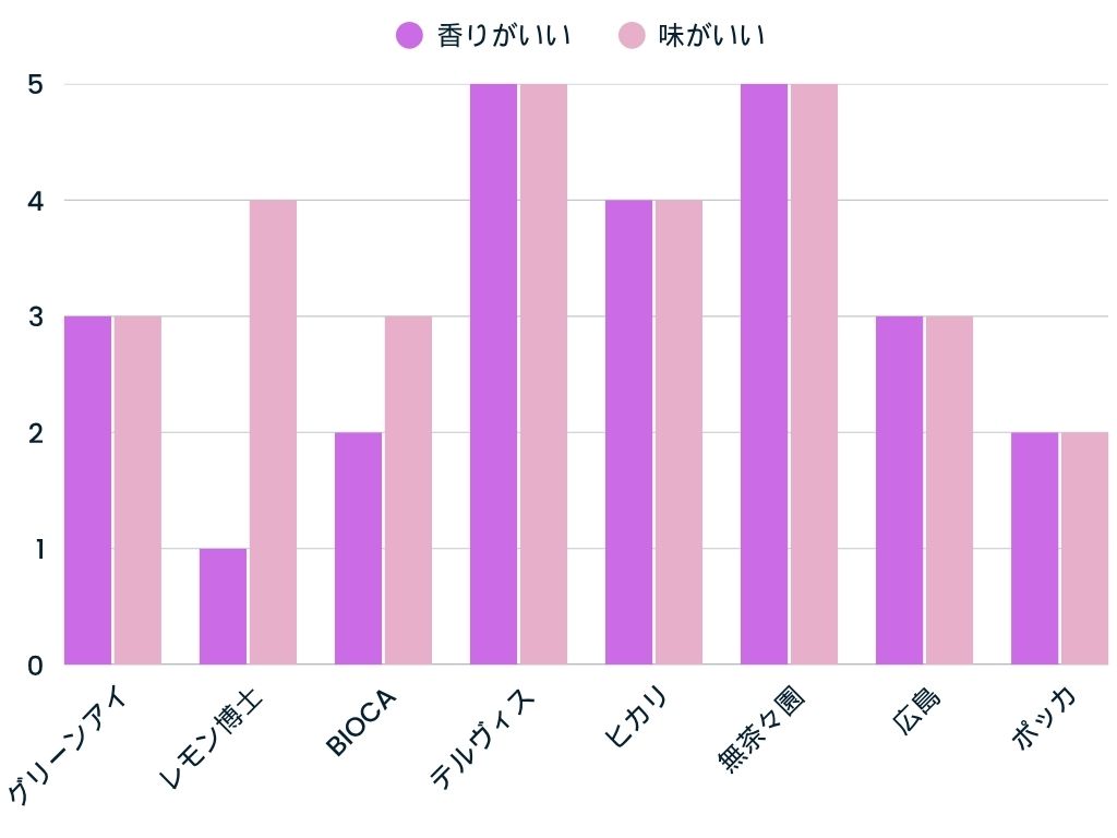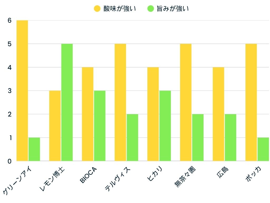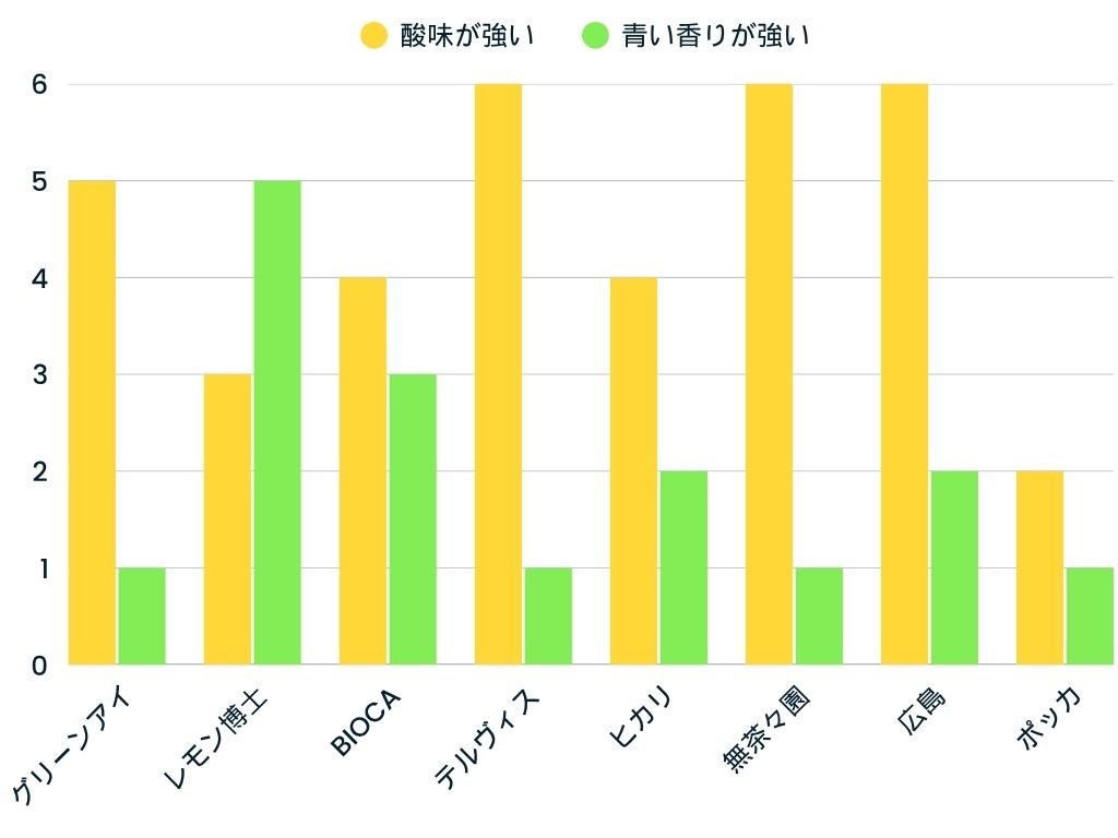 特徴 生レモンのようなフレッシュさ 果汁感は少ないがバランス〇 香りが青いがうま味が強い 少々の青さ・うま味、フレッシュ感 濃縮感のあるうま味とフレッシュさ レモンピールのキリッと感 日本風味のレモン感 酸味の中に甘みのニュアンス